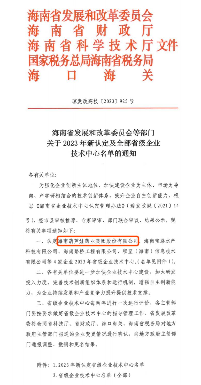 近日,海南省发改委等多部门联合公布了《关于2023年新认定及全部省级企业技术中心名单的通知》,其中,海南DB电竞药业集团股份有限公司成功通过评审,被认定为省级企业技术中心,是本次获批的4家企业之一。